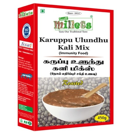 Take Karuppu Ulundhu Kali Mix and stir with hot milk or water like as dosa batter. In a pan, pour sesame oil or ghee and roast with Cashewnut. Mix the roasted Cashewnut with the batter and stir well. Heat the mix for 10 minutes in sim and stir often. Take chopped Karuppatti or Jaggery (one cup Karuppatti or Jaggery for one cup karuppu Ulundhu Kali Mix), mix with water and heat until the Karuppatti or Jaggery turns into a liquid. Then, filter the Karuppatti water and pour the same in the Kali Mix. Heat this mix in sim mode for 10 minutes and stir often. Taste the Karuppu Ulundhu Kali Mix in hot or chill.